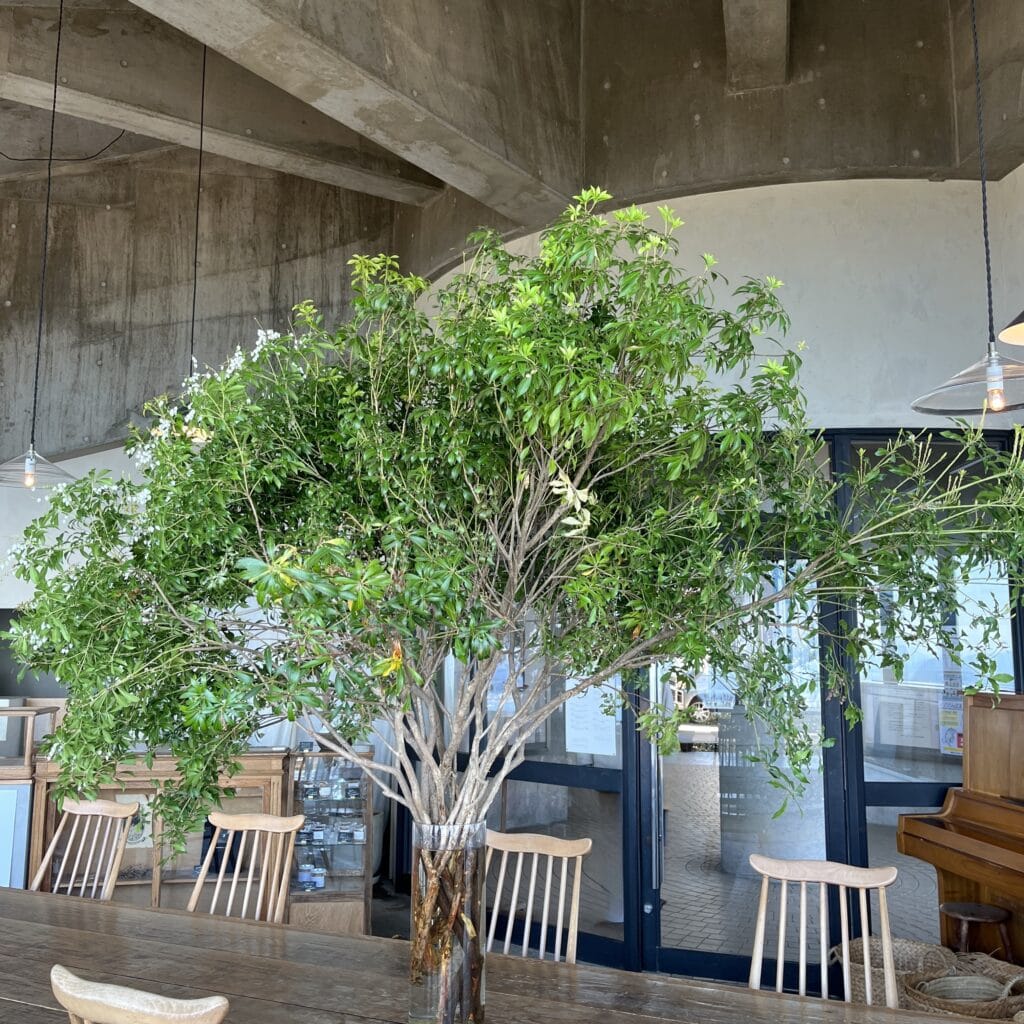 大きな窓から空と海が眺められるし、店内には大きなアセビの枝もあって、外の景色と一体になれるような開放的な空間でした。
