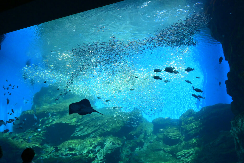 入ってすぐの大水槽は迫力満点!イワシの群れが織りなす光のショーも必見!