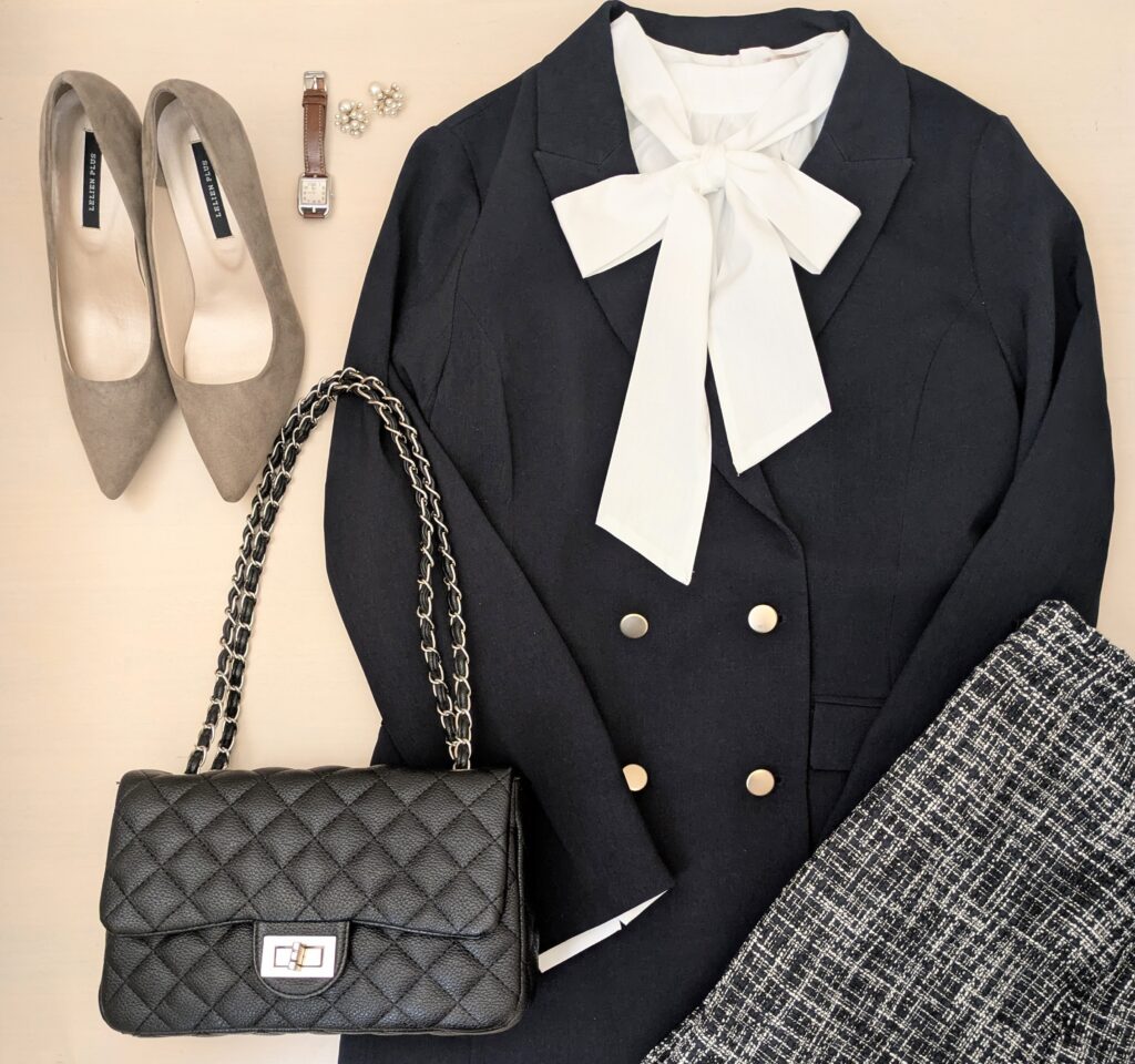 リボンブラウスに紺ブレ、紺のツイードスカートをあわせてみました