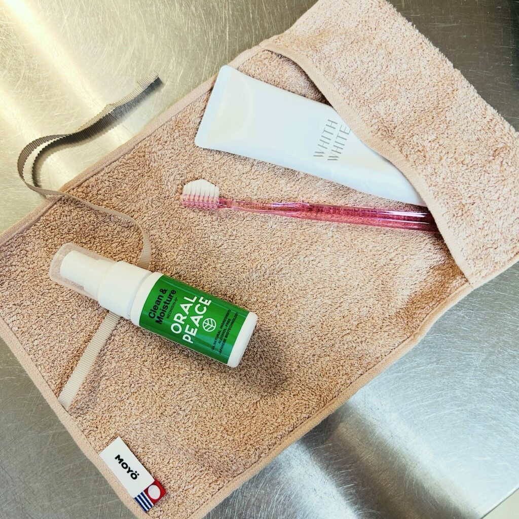 タオルに歯ブラシと歯磨き粉を挟んでくるくるっと巻き、荷物の中に入れています。