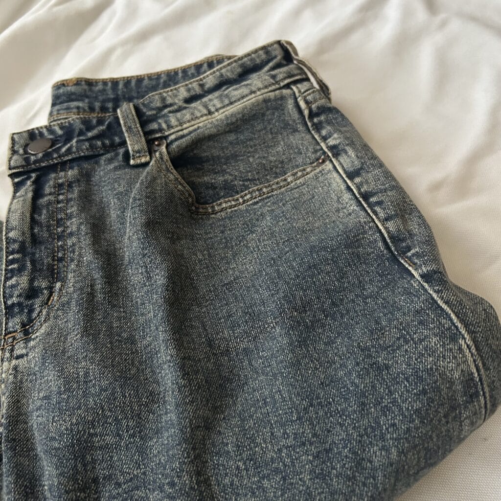 ブルーはヴィンテージライクな生地感が特徴的。ベルトループなど細部までしっかり作り込まれてて高見えするかと思います