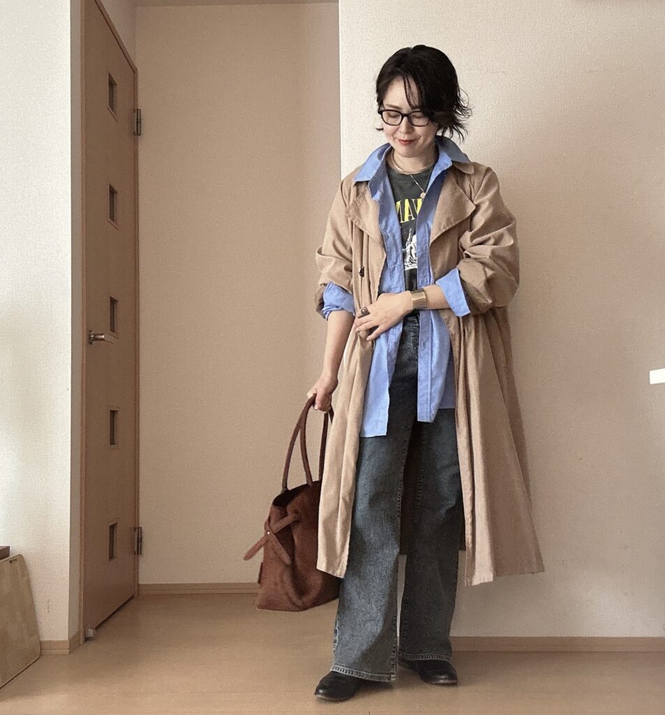 ロックTにブルーシャツを重ねてレイヤードコーデ。着丈長めトレンチもスッキリ。このコーデでランチに出かけたいな♬