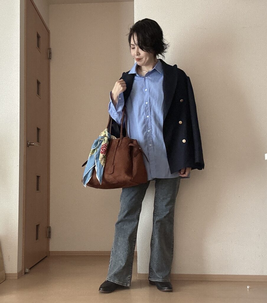 春ジャケットに合わせてみました。ネイビー✖️キャメルの色合わせが大好き♬