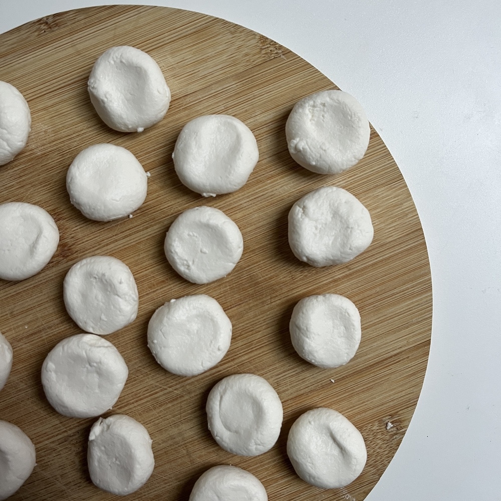 白玉粉と豆腐をよくこねて、ちぎって丸めます。