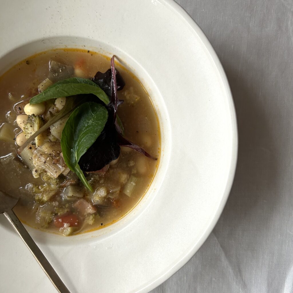 春野菜を少量ずつ、たくさんの種類を合わせて煮たスープ、