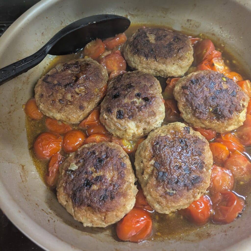 ハンバーグはこのレシピをベースに、ソースは適当。時短で洗い物も最小限!