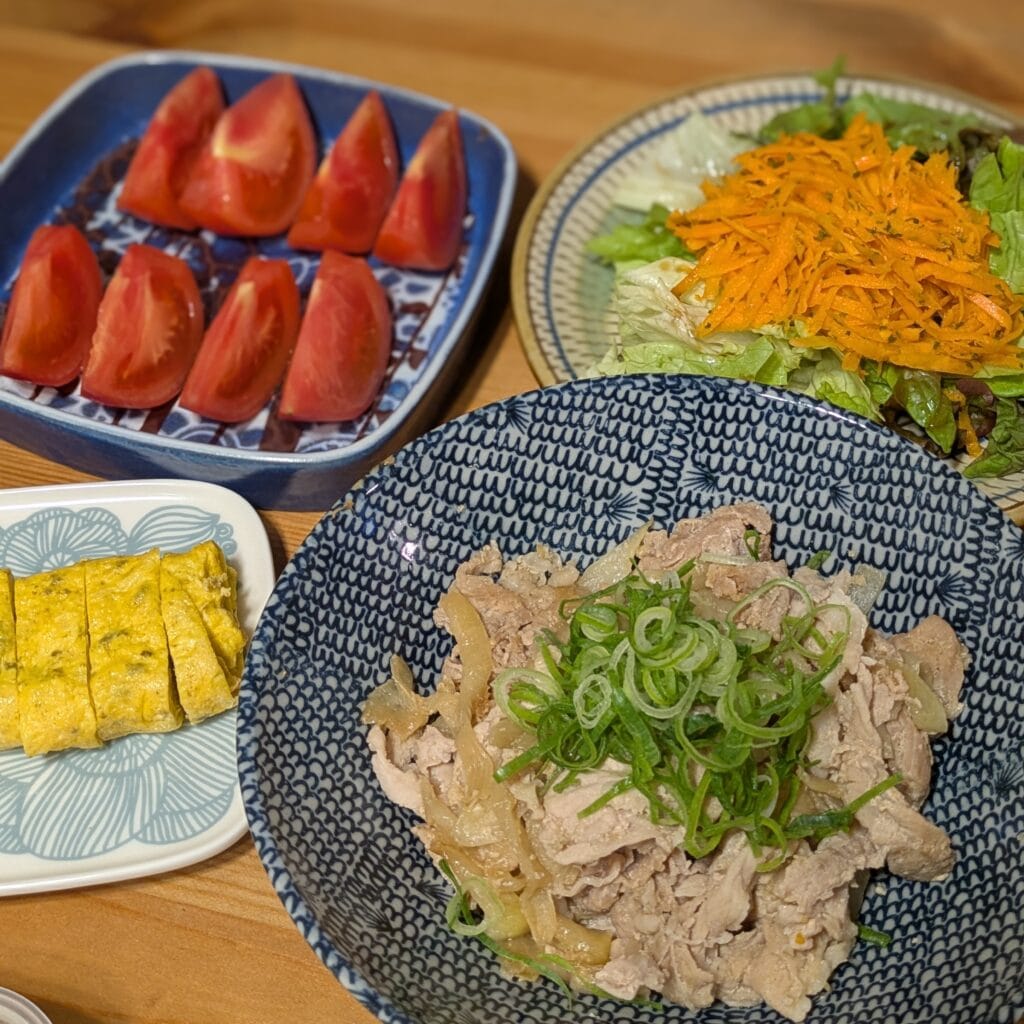 豚肉と玉ねぎは固定で、その時々ある野菜を足したりしています。