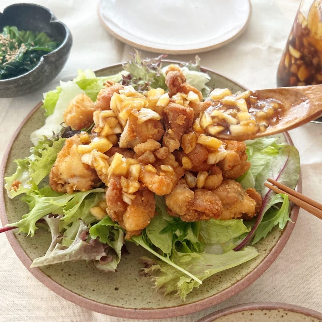 この日は、前日の唐揚げが残ってたので、唐揚げサラダにしてドレッシングをかけました。