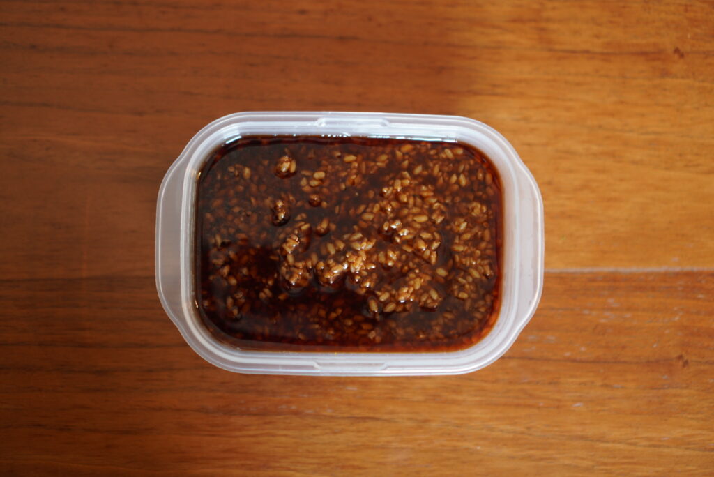 出来上がった醤油麹はタッパーに入れて冷蔵庫で保管。