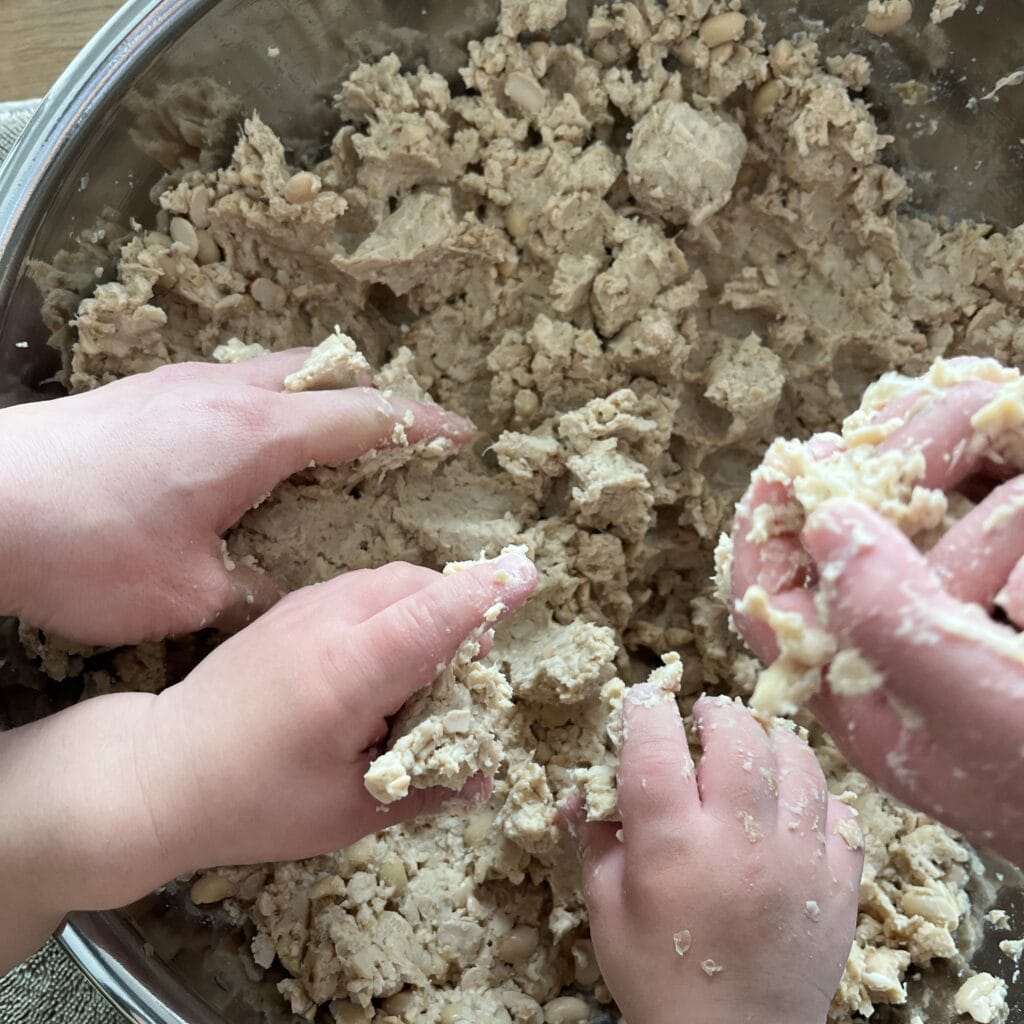子どもの手の常在菌でさらにおいしくなると教えてもらい、ここで子どもたちの出番。
