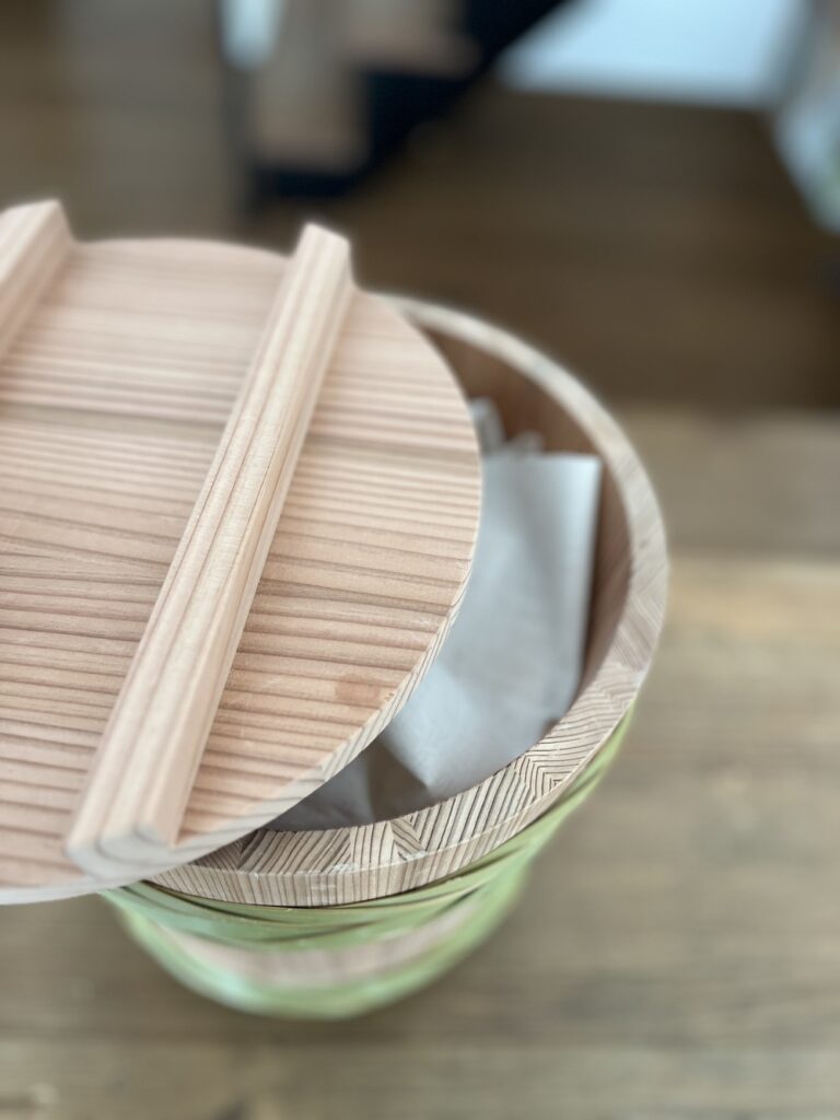 今まではプラスチックの容器やラミジップで仕込んでいましたが、今年は杉桶で仕込みました。