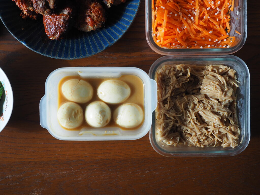 我が家にこれだけ副菜が揃うのも珍しく、記念に写真をパシャリ。今週はこれに鶏ハムを足せばいけそうだと思うとなんだかとても安心。