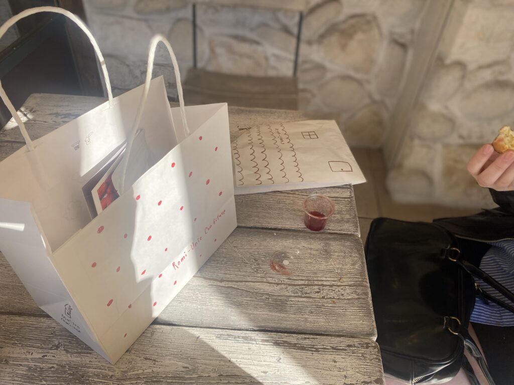 お店の前の椅子に座らせていただき、まだほんのり温かなスコーンをお店のジャム(いちごとキャラメルから選べました)と一緒に食べて幸せ~♡