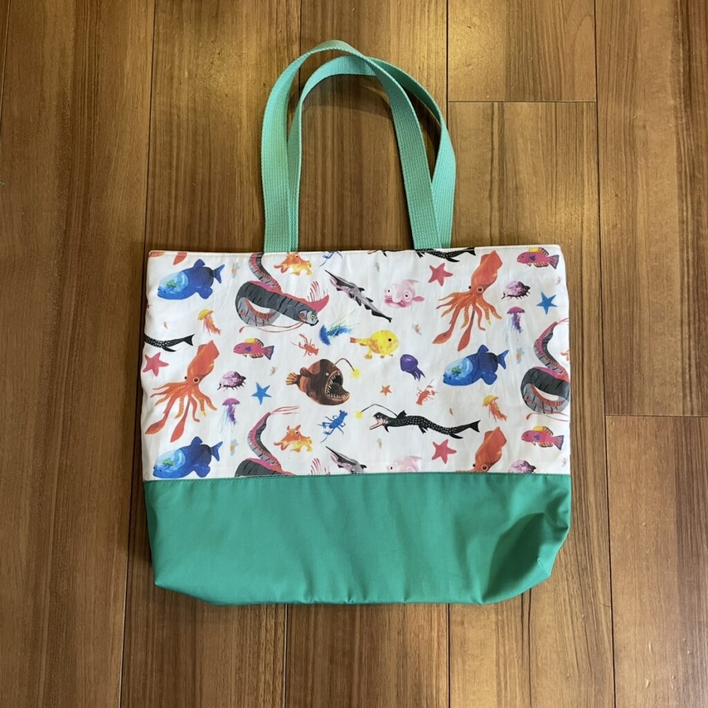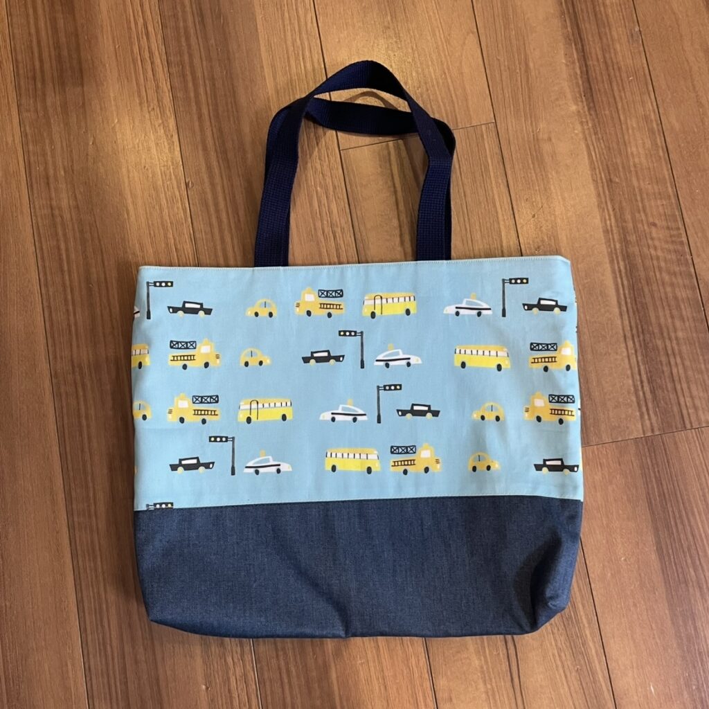 長男の通う小学校では、道具を入れて持ち運べるよう音楽と図工でそれぞれ専用のバッグを用意するよう指示がありました。小学生男子ですもの、丁寧に扱うのは難しいと思いなるべく丈夫に…!という気持ちで作りました。表の布地はツイル、裏布はキルティングです。