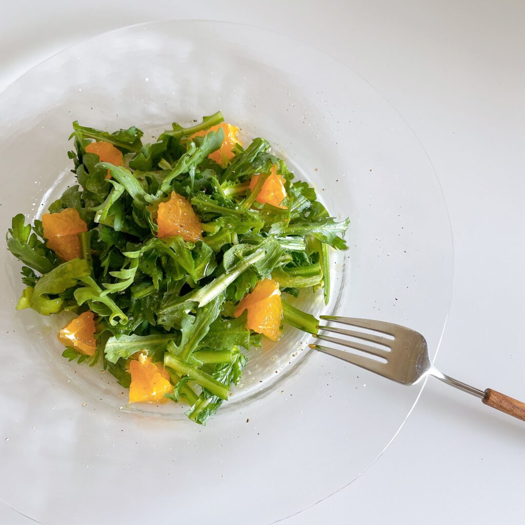洗ってざく切りにした春菊にカットしたオレンジをのせて、オリーブオイル、塩、ブラックペッパーで和えるだけの簡単サラダ。