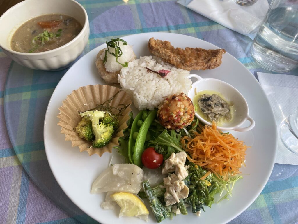 この日のランチは桜ごはんや車麩カツがメインの薬膳プレートと呉汁。