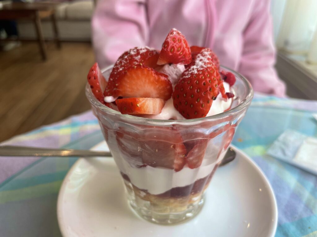 そして今回がネイビーさん初訪問!な娘がオーダーしたのは、「ピエノファームのいちごのトライフル」。ピエノファームさん栽培のフレッシュいちごをはじめ、身体に優しい豆乳ホイップクリームやヴィーガン仕様のスポンジ、ムースなどなどで何層にも重なった美しいグラスデザートです。