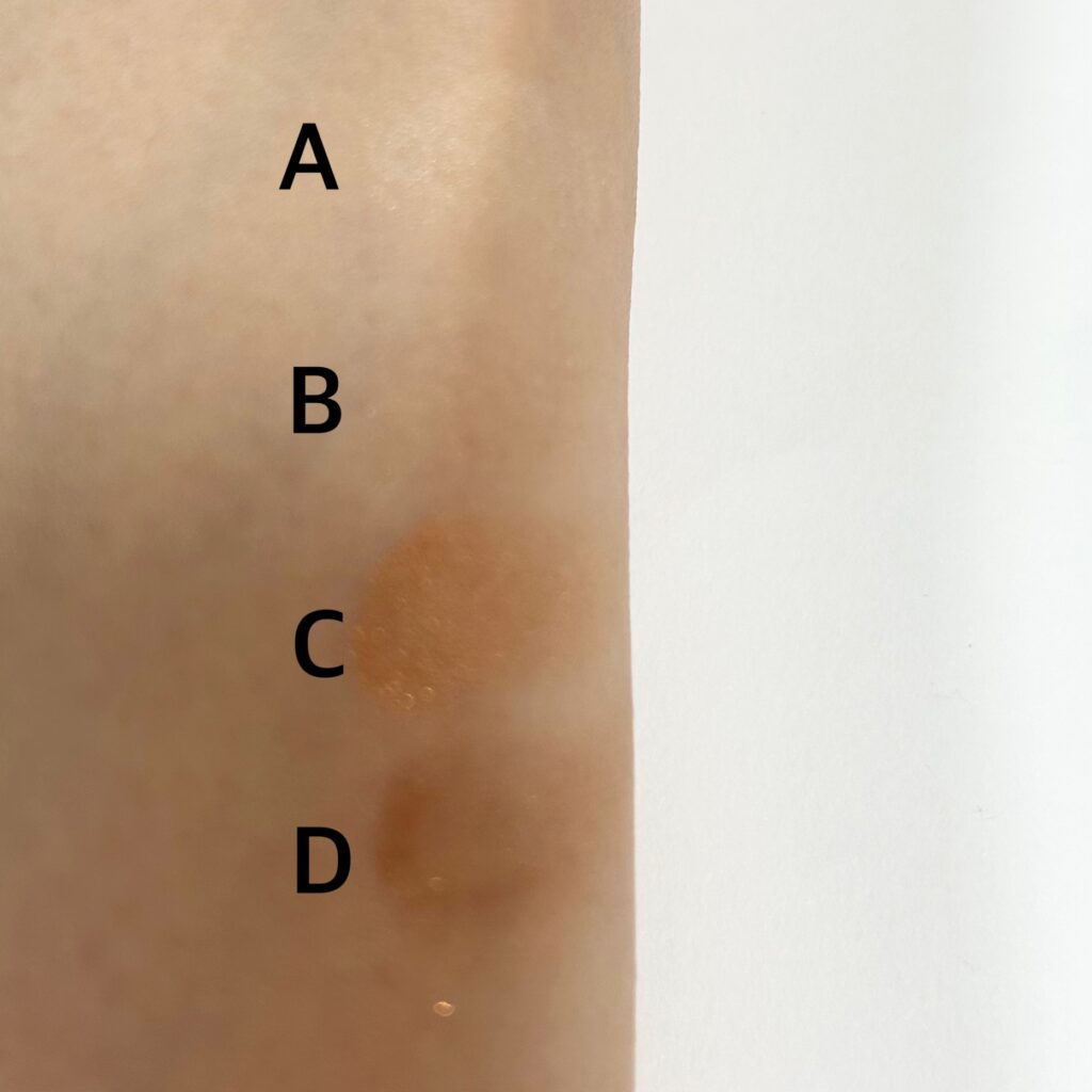 腕につけると、こんな感じです。わかりにくいですね…💦Bのベージュはかなり薄づきです。なので、その日の気分や服装に合わせて濃さを加減しています。