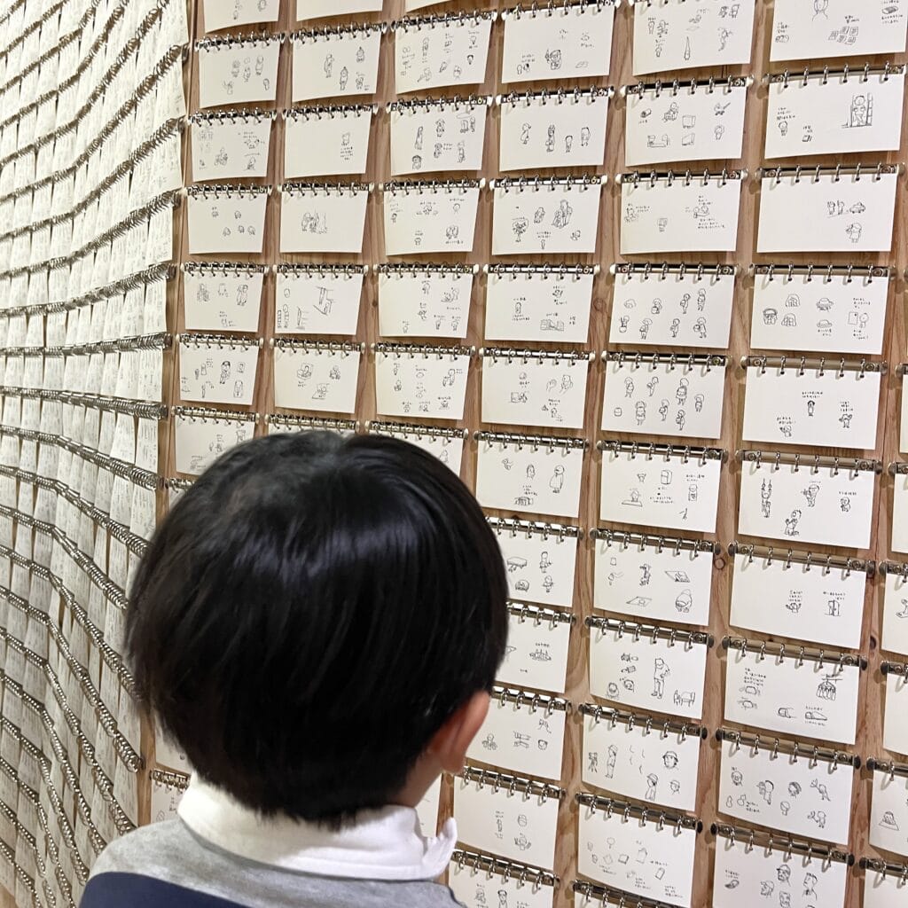 ヨシタケさんがデビュー前から描き溜めてきたというスケッチ。クスクス笑いながら、一枚一枚じっくり読む次男。さすがに全部は読み切れない枚数!