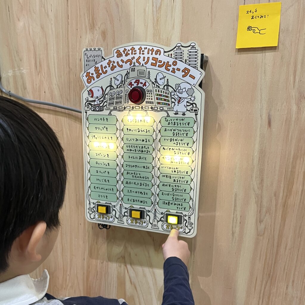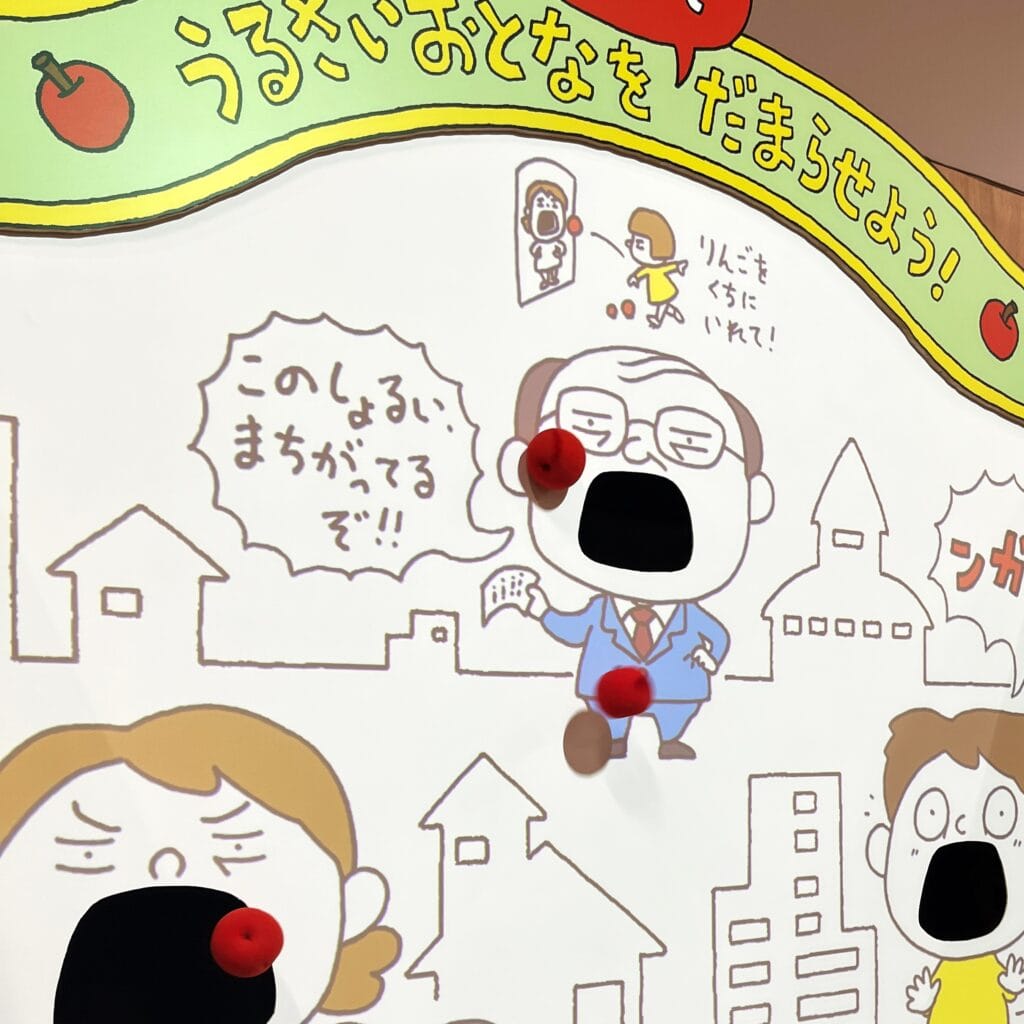 ヨシタケさんの人気絵本の世界観を体験できる展示には、自分だけのおまじないを作ることができる装置や、うるさいおとなにりんごを投げるゲームなどあり、どれも子どもたちで大賑わい。
