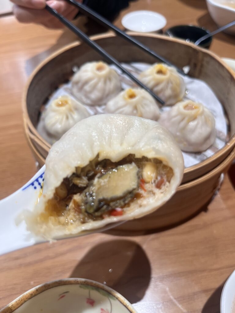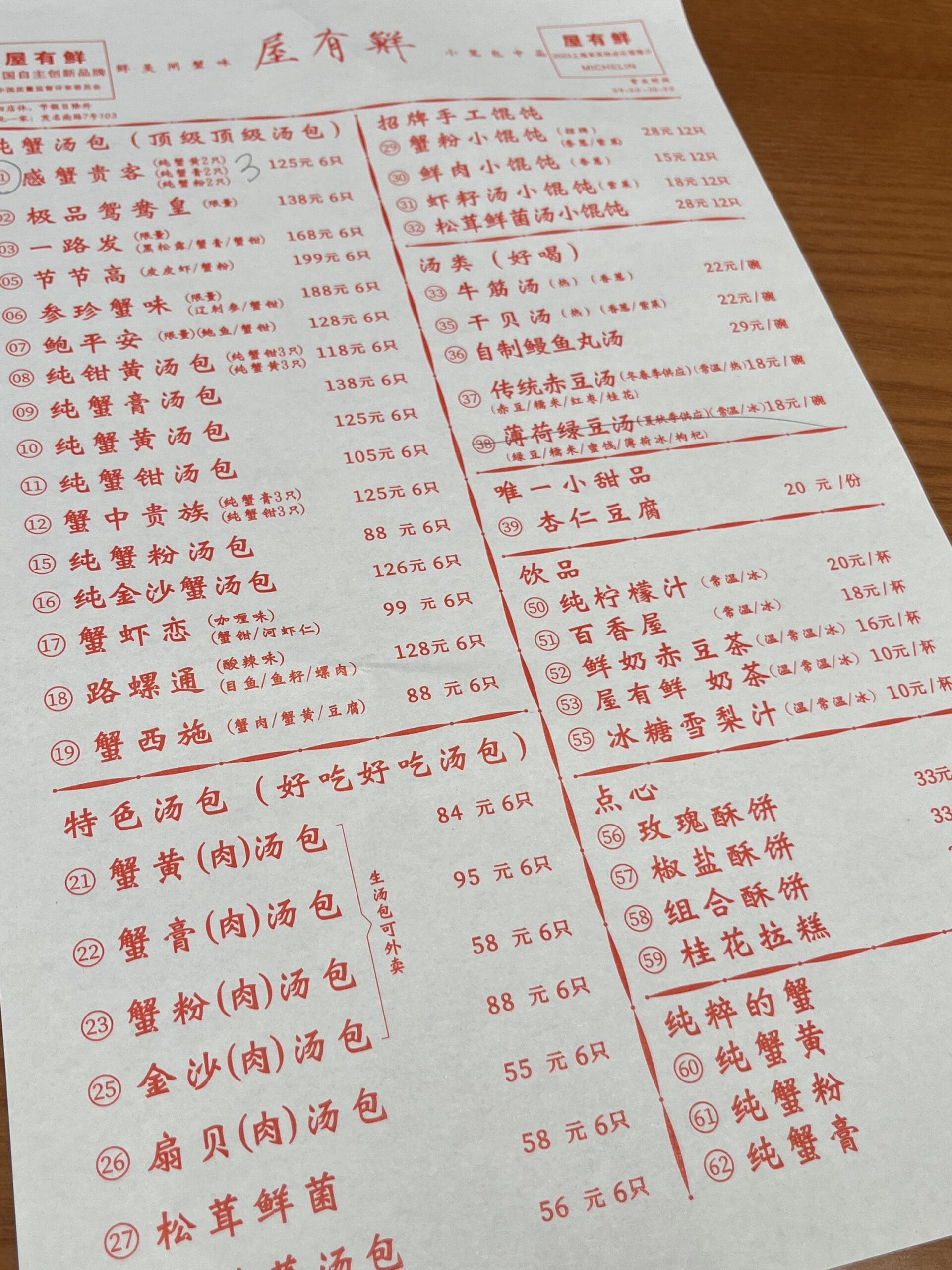 『蟹粉汤包』の名店はいくつかありますが、そのなかでもおすすめなのが「屋有鮮(Wū Yǒu Xiān/ウーヨウシェン)」。もともとは上海郊外の「召稼楼古鎮」という歴史ある水郷にひっそりと佇んでいたお店ですが、最近、上海都心にリニューアルオープンしました!そして2024年にはミシュランの星付きレストランに。「屋有鮮」は、「店には鮮(新鮮さと美味しさ)がある」という意味。その名の通り、新鮮な素材を丁寧に扱い、鮮やかで奥深い味を生み出しています。上海蟹の小籠包が売りなので、少し値が張りますが、その価値はあります!