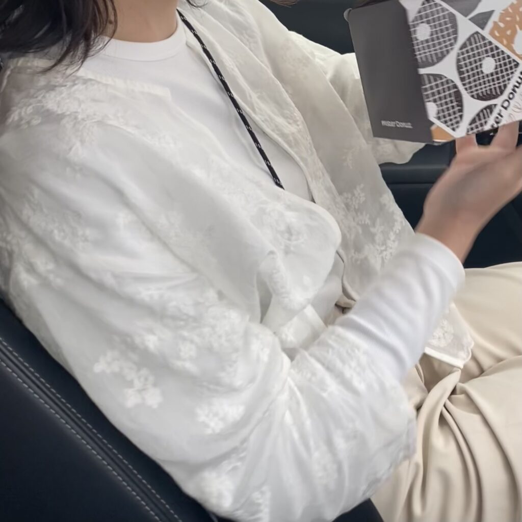 トップスはUNIQLOソフトリブクルーネックに、studio CLIPのレースカーディガンを合わせました。