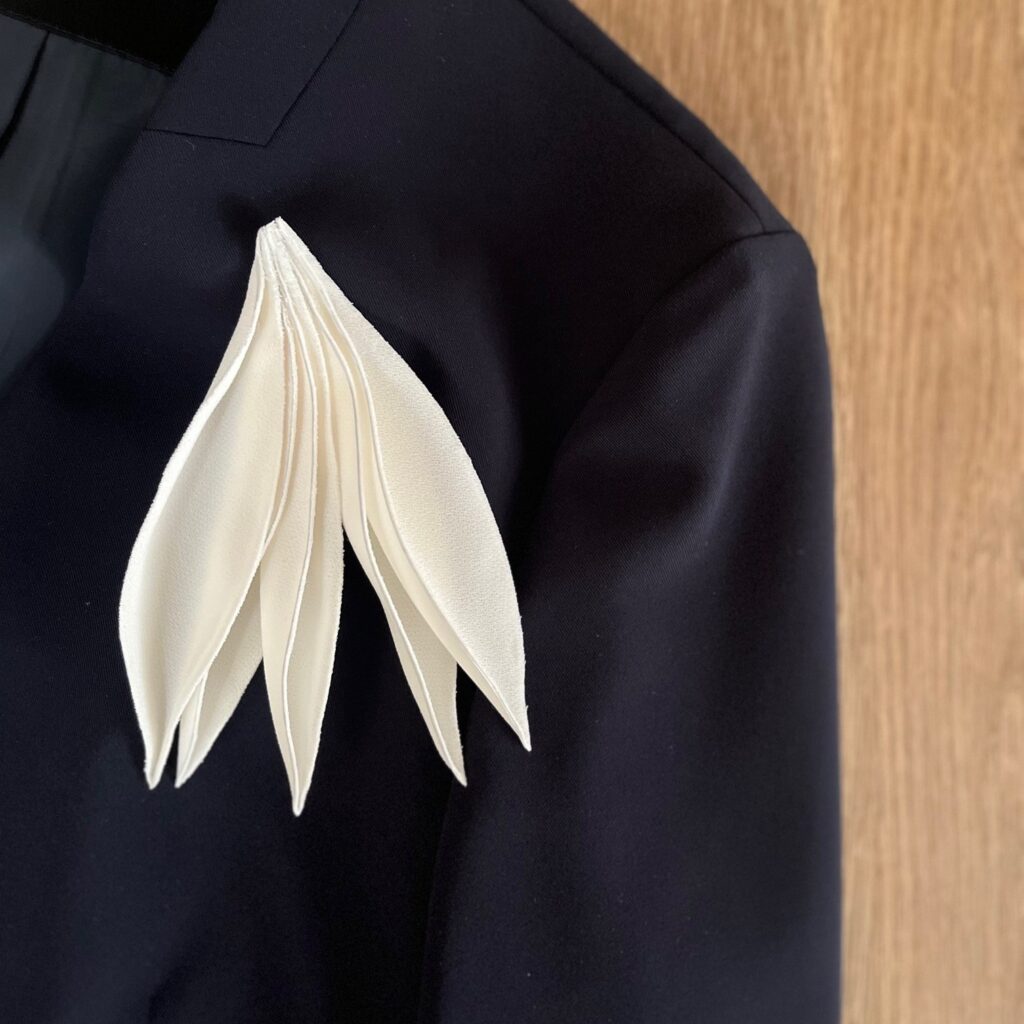 つける位置や付け方、リーフの向きによって表情が変わるのがこのコサージュの魅力だなぁと思います。