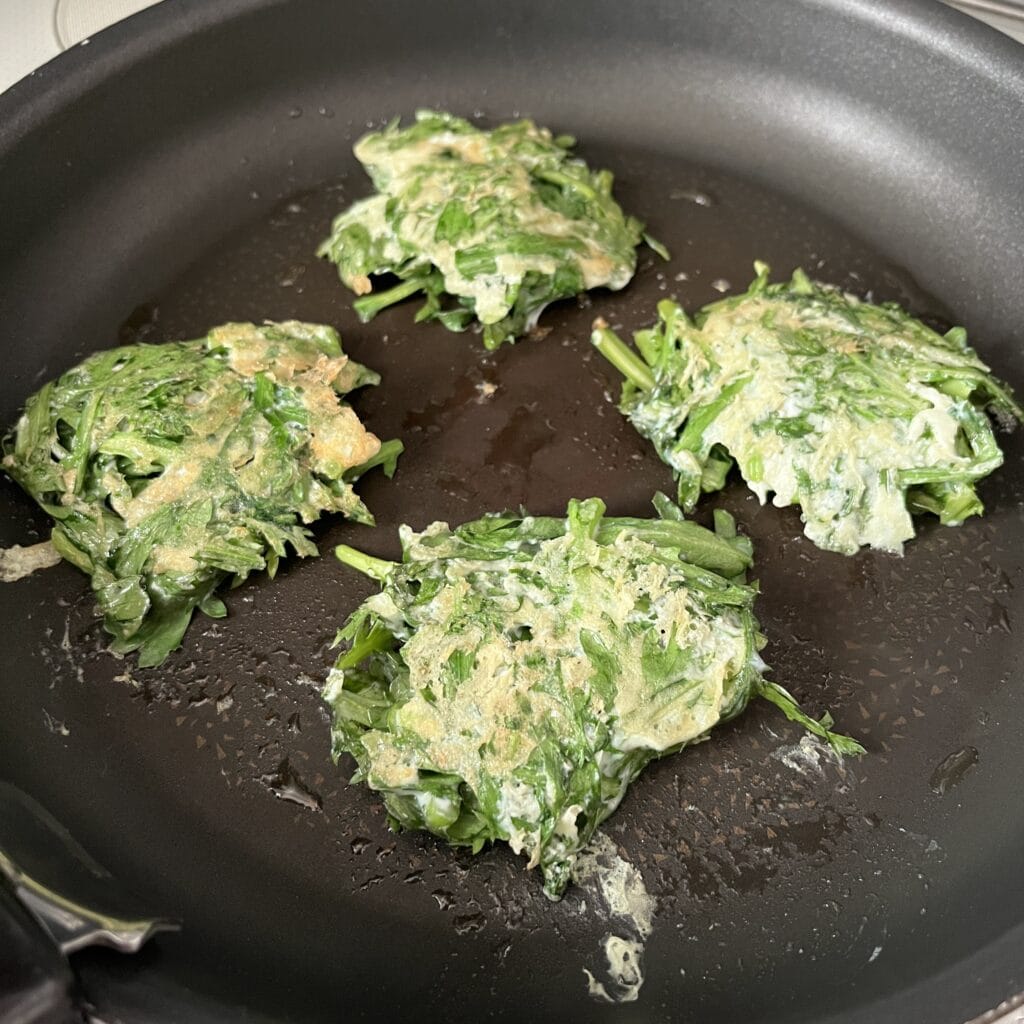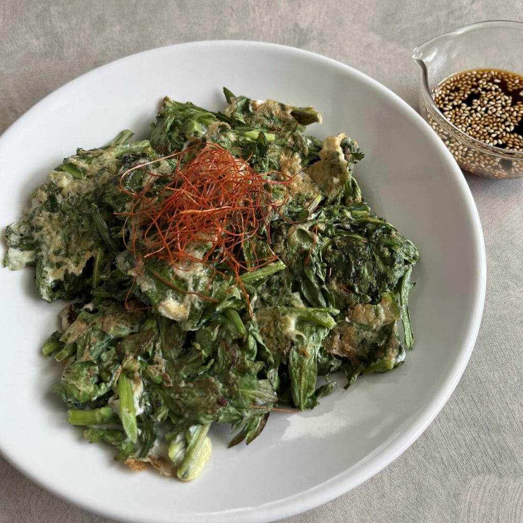 チヂミのようなふわっとした生地ではなく、春菊そのものの食感や香りを味わえるレシピ。