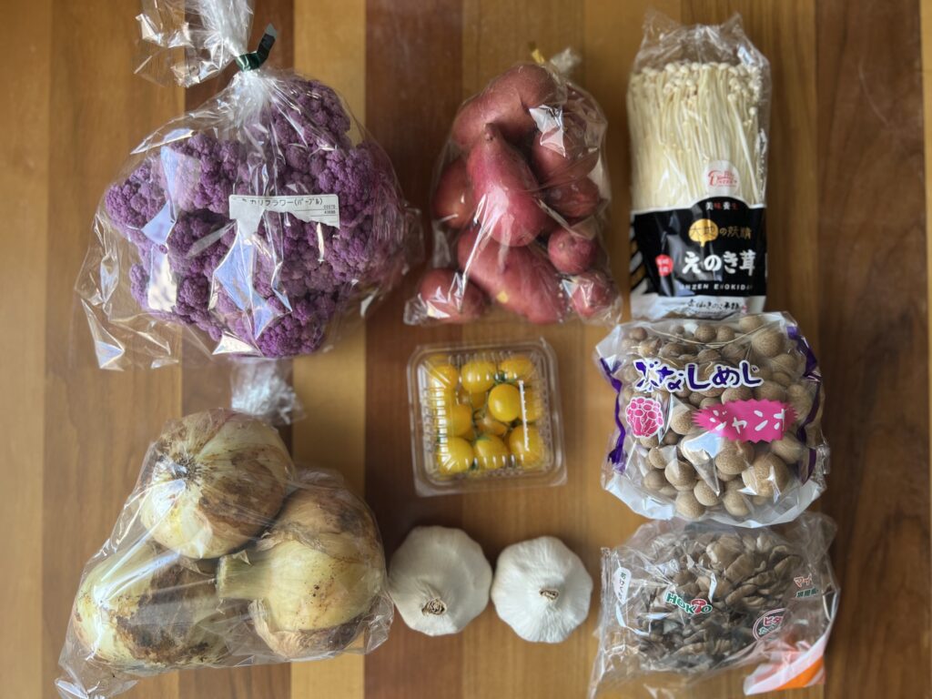 別の日のお買い物。立派な紫カリフラワーを見つけたのでピクルスみたいなマリネを作りました。ごろごろした大きい新たまねぎと一緒に大好きな紅じゃがいももお買い上げ。揚げても煮ても何にしても美味しい紅じゃがいも(愛が深い)。黄色のアイコさん(ミニトマト)は小さめサイズだったけど甘いミニトマトらしい味だった。