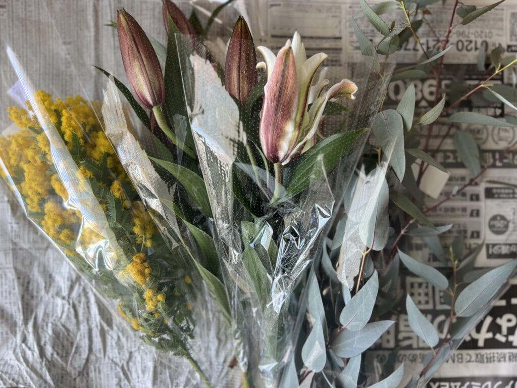 お花で季節を知って感じることも日々の暮らしで大切にしたい。今回買ったお花はミモザ、ユリ、ユーカリ。