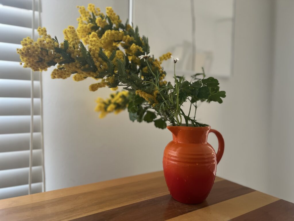 さっそく花瓶ではなくピッチャーにミモザを生けました。