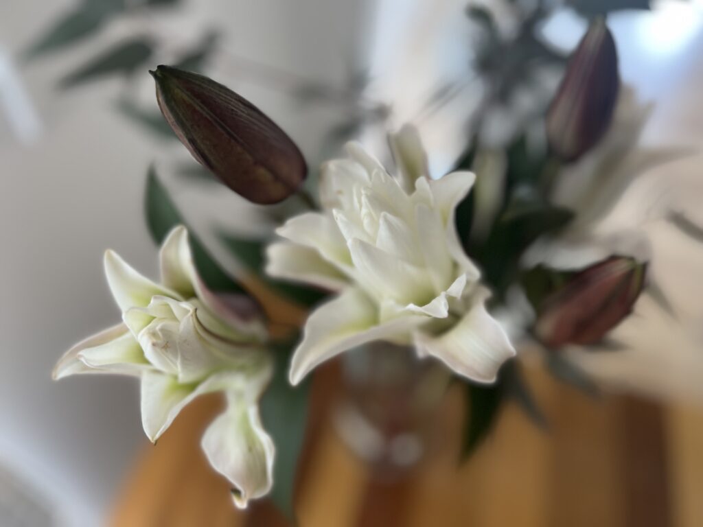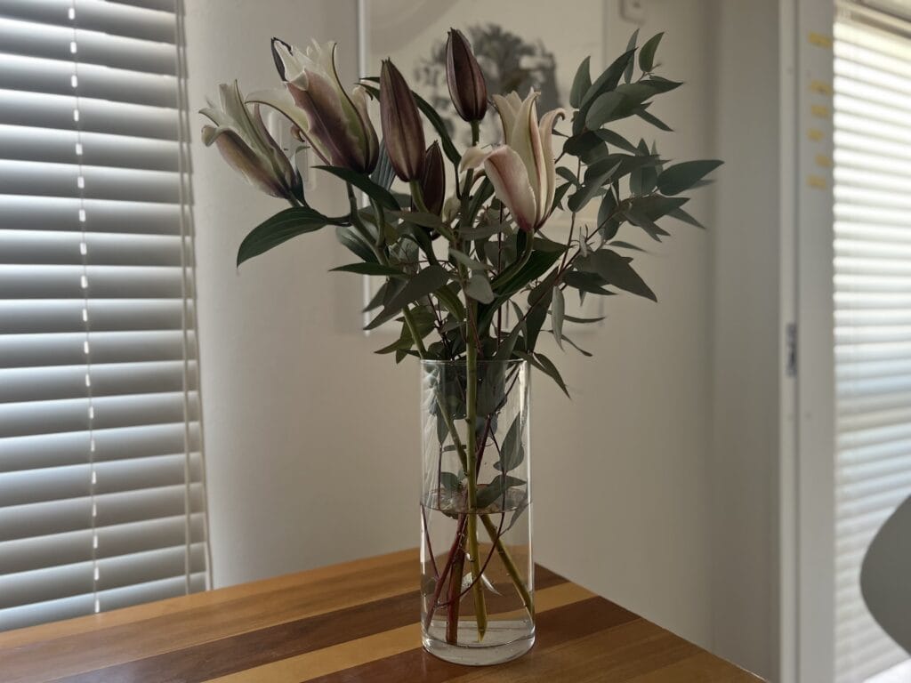 今度はちゃんと花瓶に生けたユリとユーカリのコラボレーション。