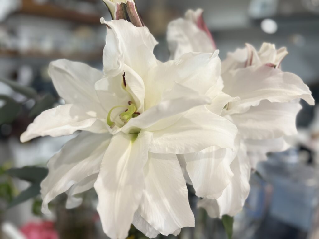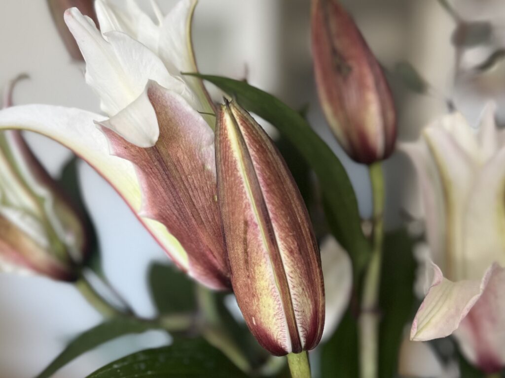 八重ユリはユリの中で一番大好きな品種。ちなみに花言葉は「控えめだからかわいらしい」らしい。たくさん色のバリエーションが揃っている事は認識しているのですが、初めて見た白にあずき色が混じったこちらの八重ユリが素敵すぎる。