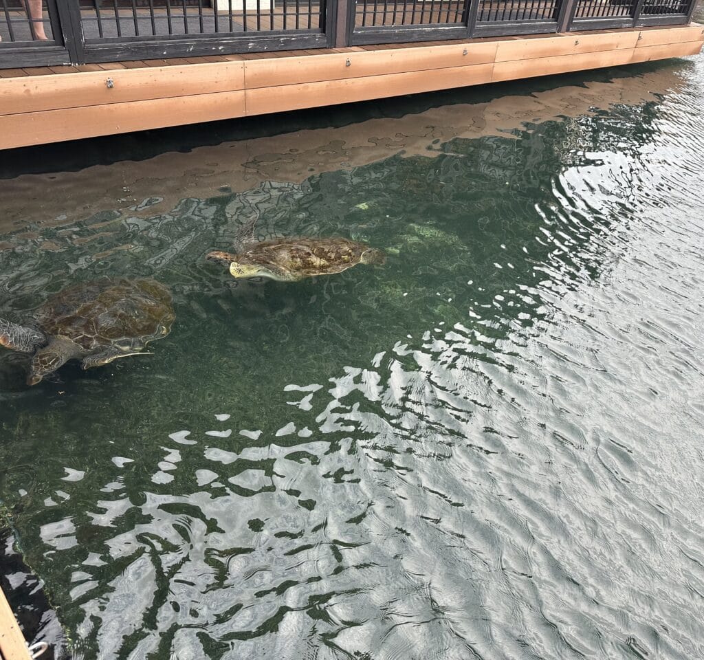 テラス側の席では大きなウミガメが泳いでいて、餌をあげることもできました。かわいい♡