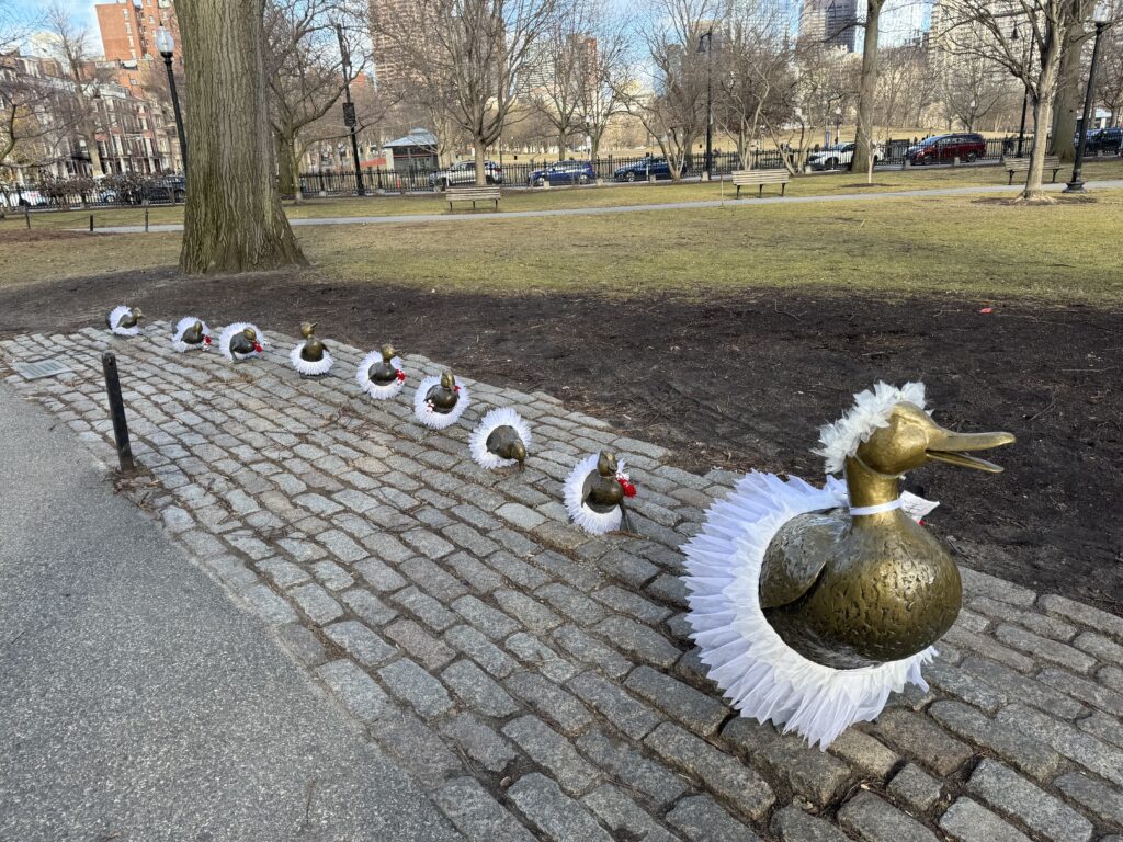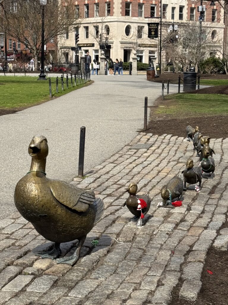 季節ごと?なんのタイミングかわかりませんが、ボストンコモンに行くたびに違う衣装を着れられているducklings 銅像.