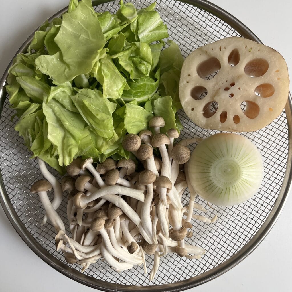 使う野菜は春キャベツ、しめじ、新玉ねぎ、レンコン、しょうが。
