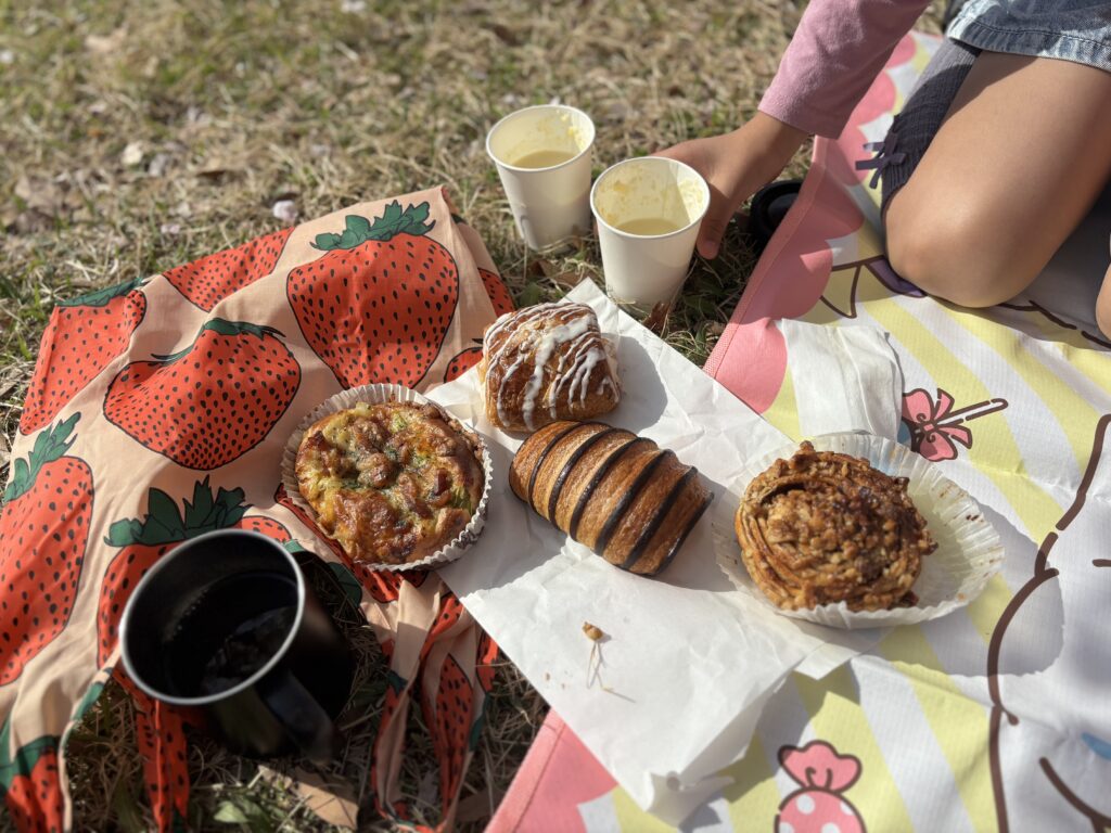 春の訪れを感じる朝の空気の中、家族でお散歩しながらパン屋さんへ。それぞれ好きなパンを購入して公園へ行きました。