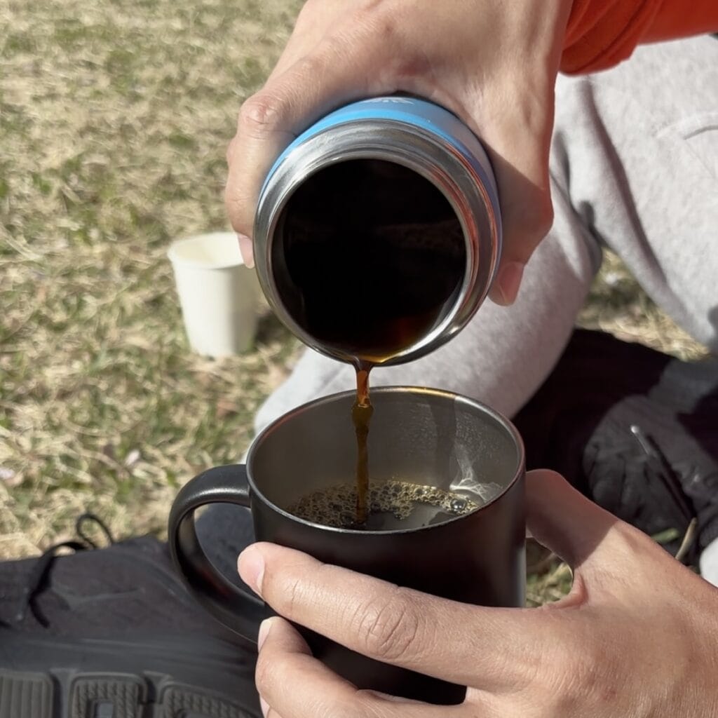 お気に入りの豆を挽き、熱々のコーヒーを淹れて持参しました。
