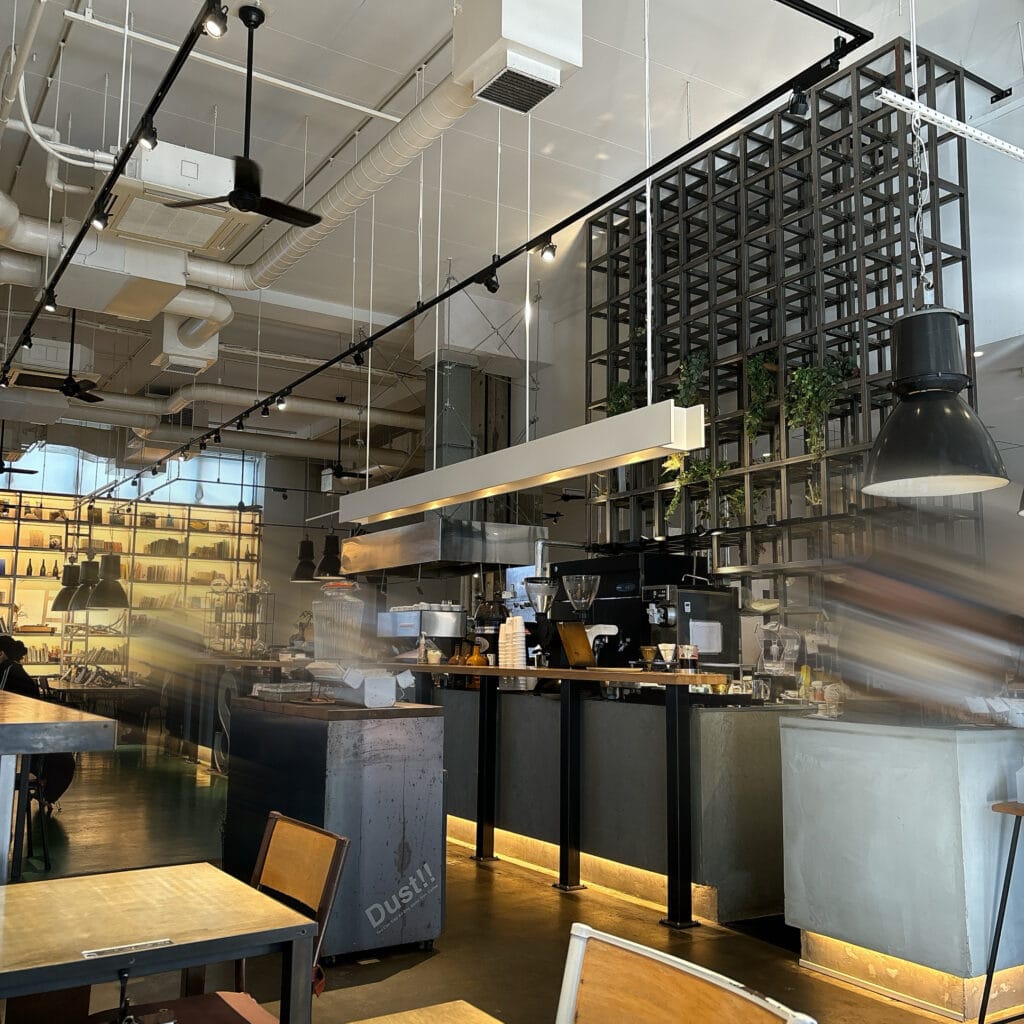 カフェカウンターがアイランドキッチンのように見える造りになっているので、店員さんがコーヒーを丁寧に入れる姿も見られる。天井のむき出しデザインもいい。