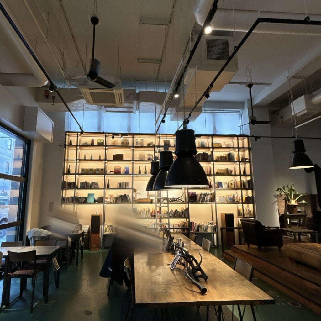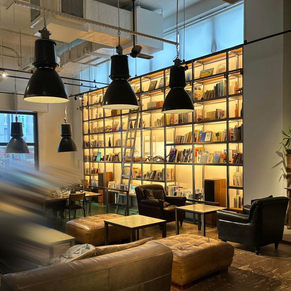 店内はあえて少し暗めで本棚の照明が映えてた。インテリアが素敵なのも特徴的。