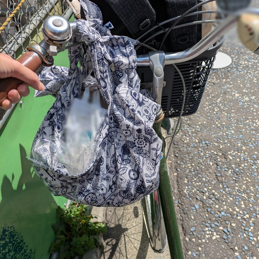 自転車でパン屋さんまで行ったのですが、風呂敷で包んでハンドルに引っ掛けて帰りました。