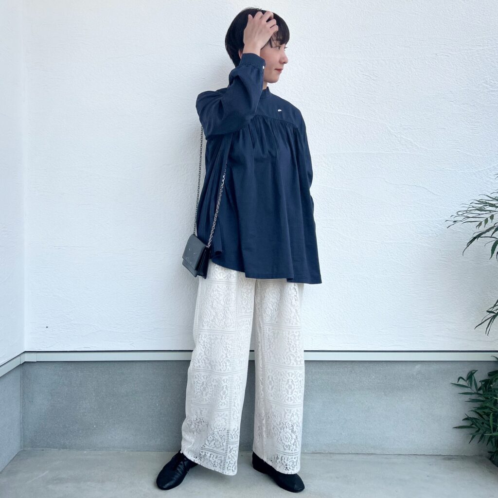 ネイビーのブラウスと合わせた日。ブラウスとも相性バッチリです。