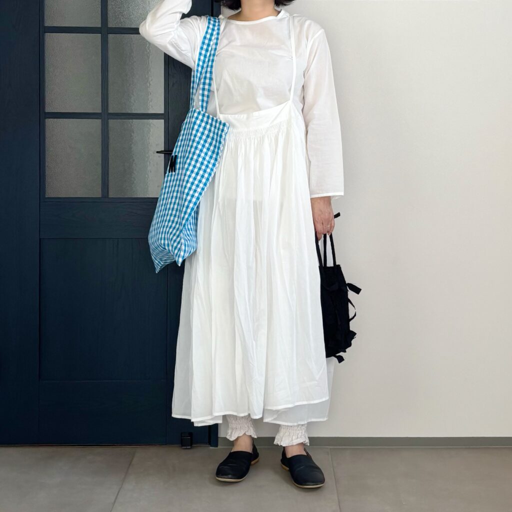 お気に入りのキャミジャンスカ、トップス、レイヤードしたペチパンツをホワイトで揃えて、水色ギンガムでさらに爽やかな春コーデ。