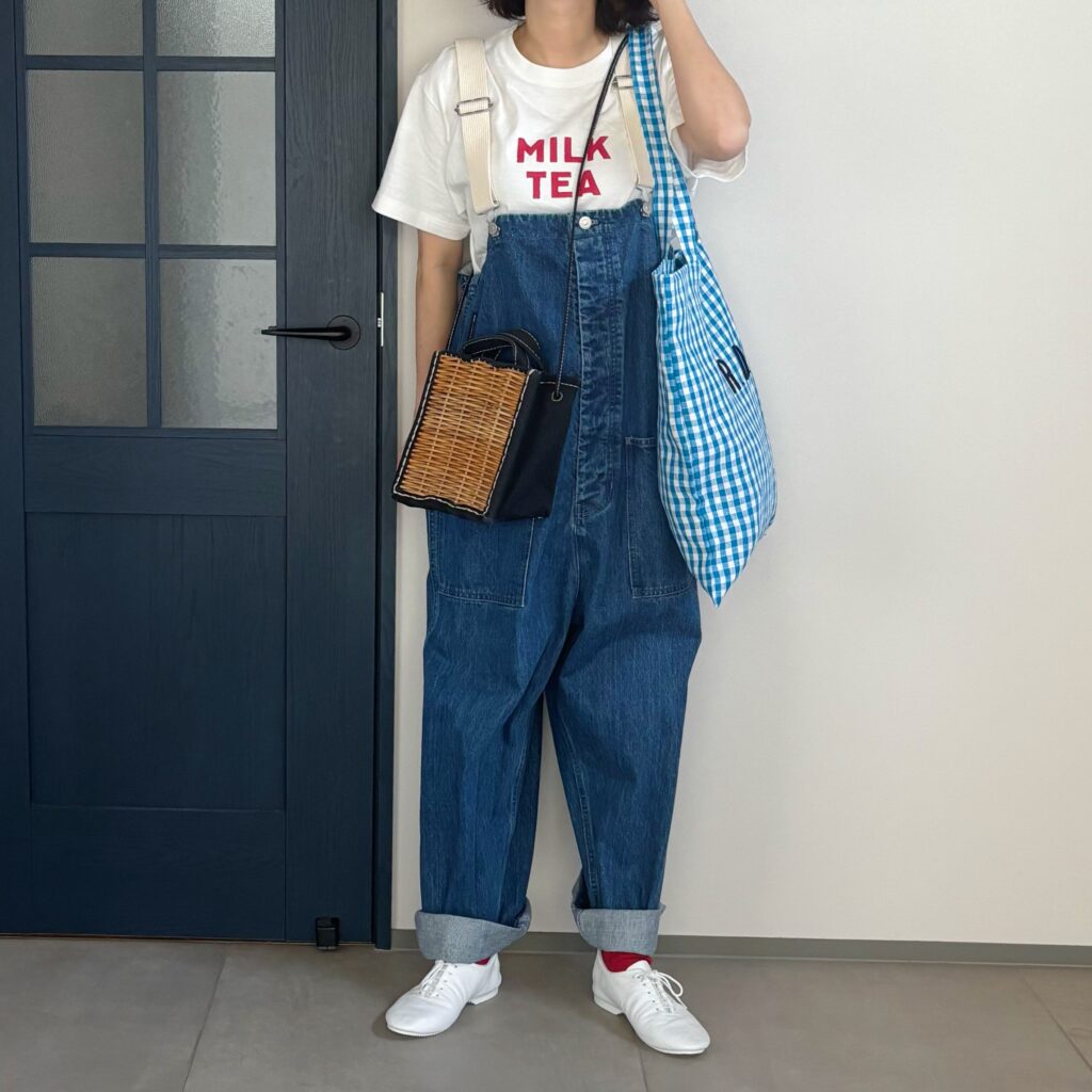 Tシャツにデニムのサロペットのカジュアルなコーデに。