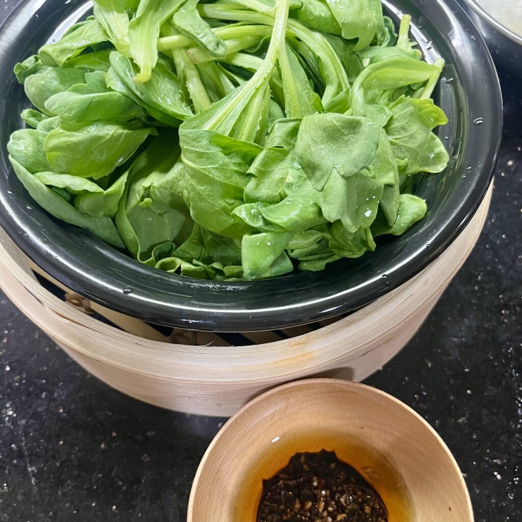 副菜は、今が旬の「大叶蓬蒿(ダイイエホンハオ / dà yè péng hāo)」を蒸しました。日本でいうところの春菊の一種なのですが、蓬蒿は葉が大きく、香りもマイルド。味付けは、中国のクックパッドを参考に、タレをつくりました。こちらの野菜料理は、シンプルに旨みを引き出すものが多い気がします。