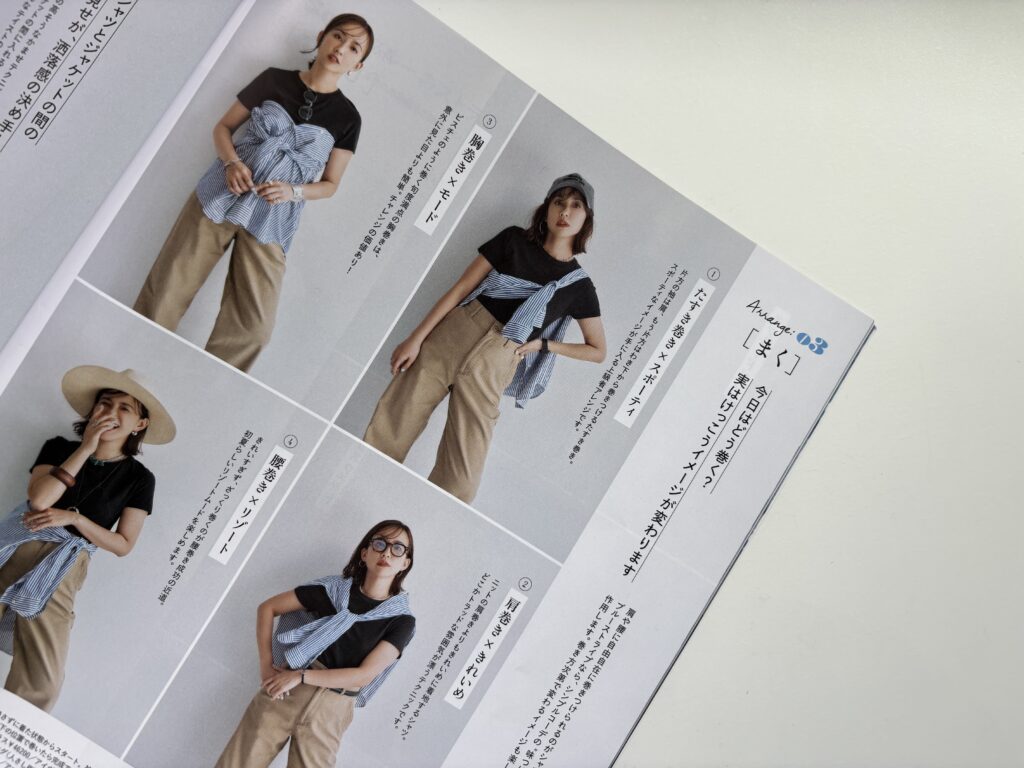 p.30の優木まおみさんモデルのページでは、シャツの巻き方でイメージが変わるというもの!