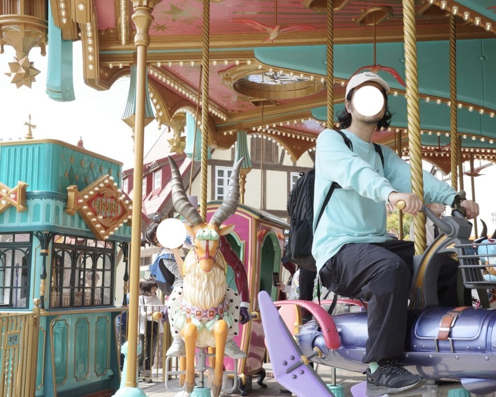 のりもの全部ジブリキャラで構成されていて、眺めているだけでも楽しすぎるメリーゴーランド! 娘は『もののけ姫』に出てくるヤックルをチョイス。