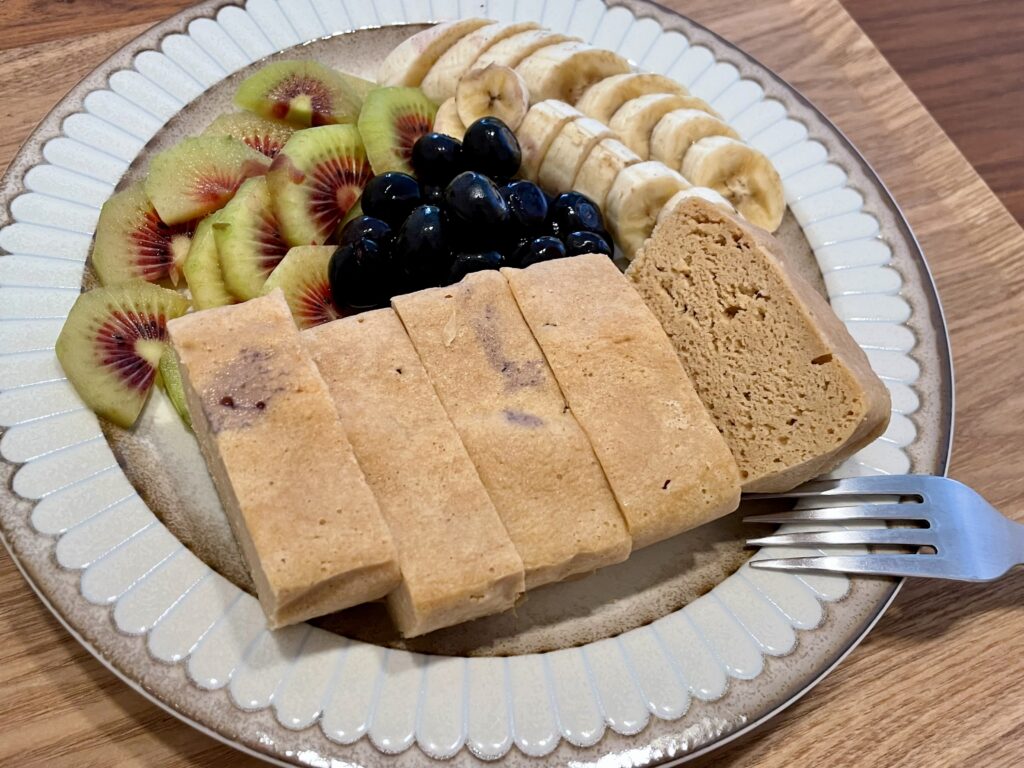 台湾カステラみたいになるかなーと期待して、卵白をブレンダーで軽く泡立ててみたけれど、あまりふわふわには仕上がりませんでした。むむう。