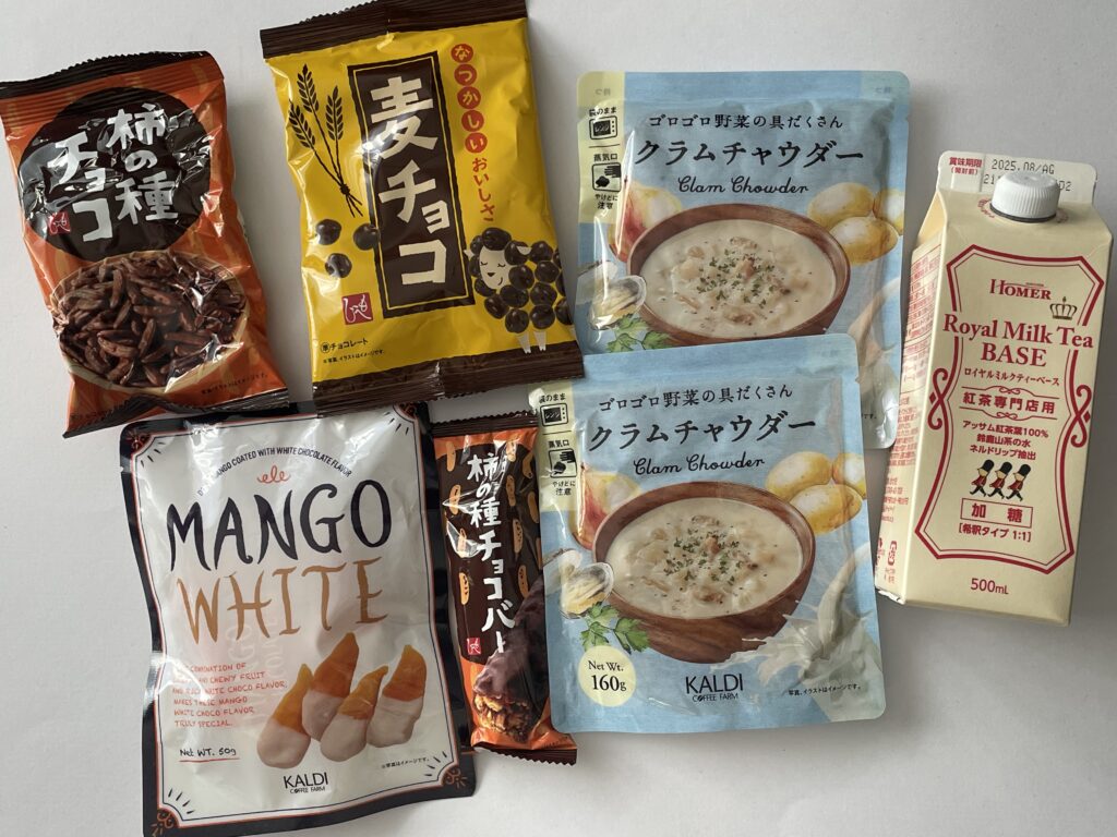 また別の日のカルディ購入品です。カルディの麦チョコは、ライブドアブロガーの「あぽり」さんのInstagramで知って、発見したら即買いするほど大好きです!!電子レンジの中で袋のまま温めることが出来る「ゴロゴロ野菜の具だくさん クラムチャウダー」は、忙しいお昼に大活躍。ロイヤルミルクティーベース(加糖)も何度もリピ買いしているアイテムです。
