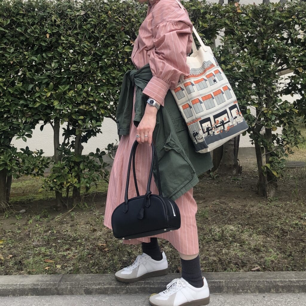 そんな日のコーディネートはLEE最新5月号を参考に、シャツワンピース×布バッグ(LEE掲載の第三のバッグの定義にはちょっと当てはまらないかもですが)で。